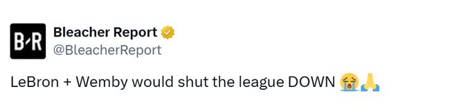 北京时间10月28日,知名美媒Bleacher Report更新社媒,写道:“詹姆斯和文班亚马这对组合能直接统治联盟啊!”他们认为马刺应该寻求交易詹姆斯,让这两位状元的联手。